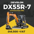 Powerful and precise, the Develon DX55R-7 Contractor Spec combines a robust 5-tonne build with advanced hydraulics for maximum control. Designed for strength, stability and all-weather performance. Available now for £46,500 + VAT – immediate delivery.